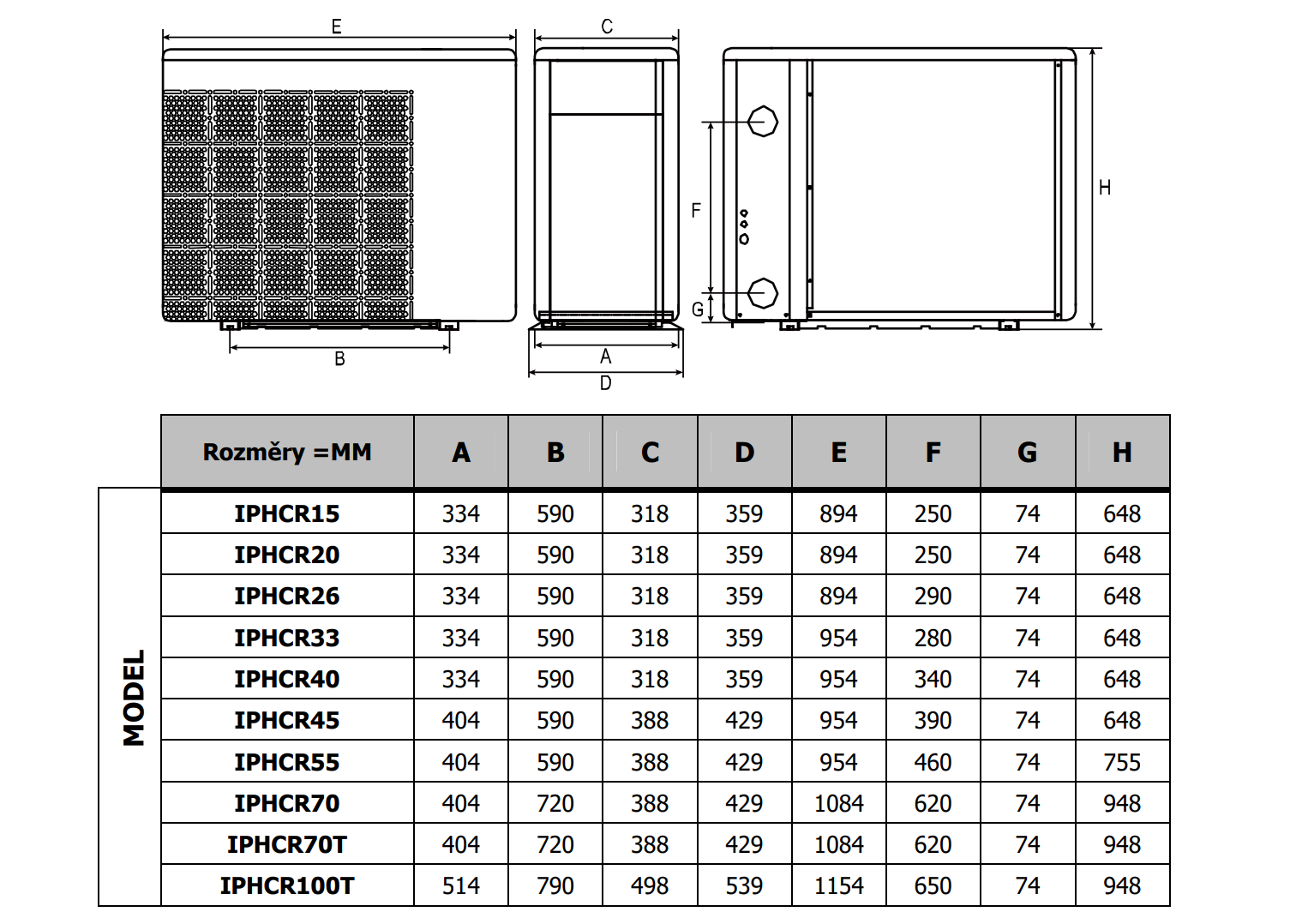 Rozměry tepelného čerpadla a rozteč pro jeho uchycení je v tabulce níže :